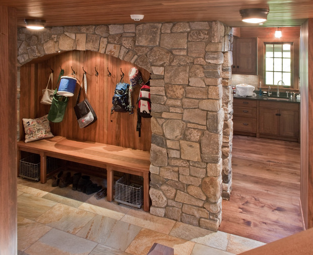 Natural stone strategically placed in this entrance hall/mudroom combo by