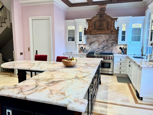 After the customer called in looking for slabs for a pink kitchen countertop, the company reached out to their global network. They found two true pink options at the Marble & Granite office in Italy. The Italian office provided photos and physical samples of both Pink Quartz and Pink Onyx for the homeowners.