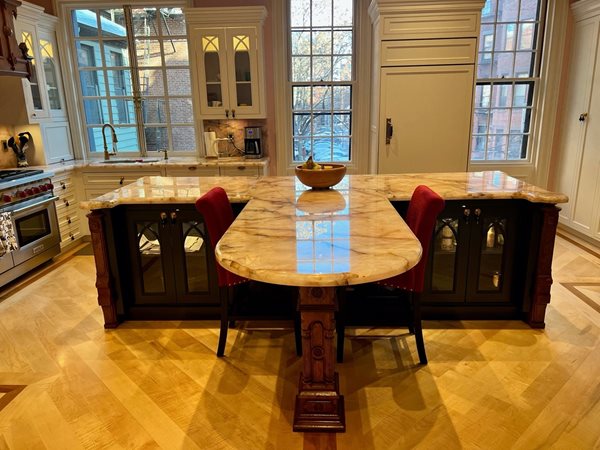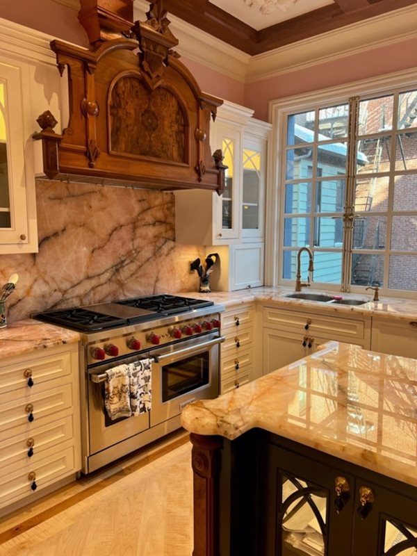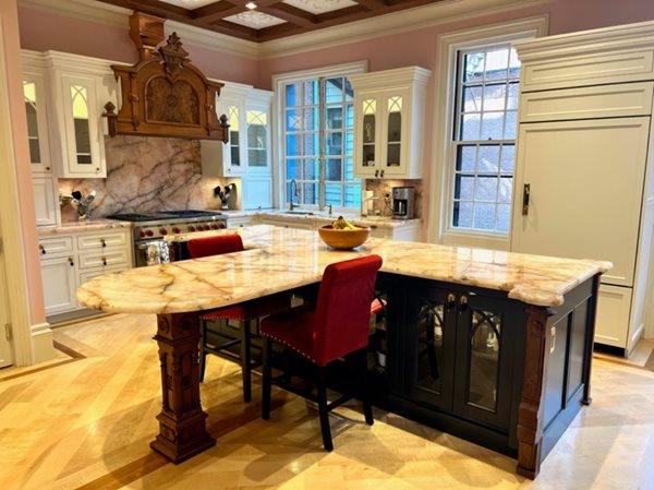 Interior Stone in Waltham fabricated the slabs as requested and the homeowners are thrilled with how the subtle pink shade perfectly complements their natural-light-filled kitchen.