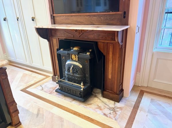 Marble & Granite team recommended to the homeowner, and what they ultimately selected. They used the pale pink stone for the kitchen countertop and backsplash as well as above and below a fireplace with a wood-burning stove.