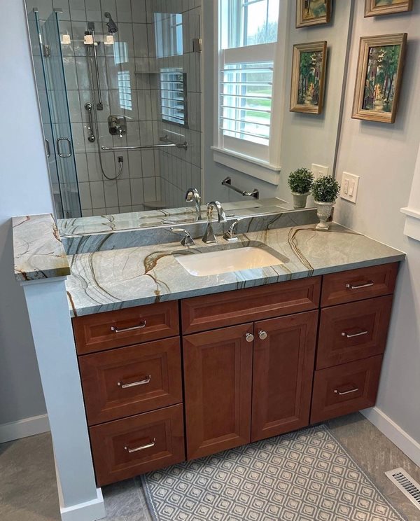 Quartzite in Blue Roma adds a warm ambiance to the bath. Photo courtesy of Compass Stone.