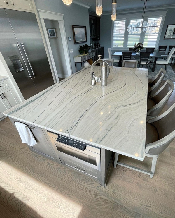 What better way to show off stone than to stretch it all the way to the ceiling. Whether it’s one  large piece of continuous stone or tiles stacked to the ceiling, the presence of all that stone adds an instant wow-factor. It’s a great way to add in beautiful natural textures and colors. Backsplashes can be matched to the countertop to make a bold statement or can be a different stone altogether for contrast. Open shelving is also a popular trend in today’s kitchens. Eliminating the upper cabinets gives you the space to show off that stone all the way up to the ceiling, around windows, and around range hoods.