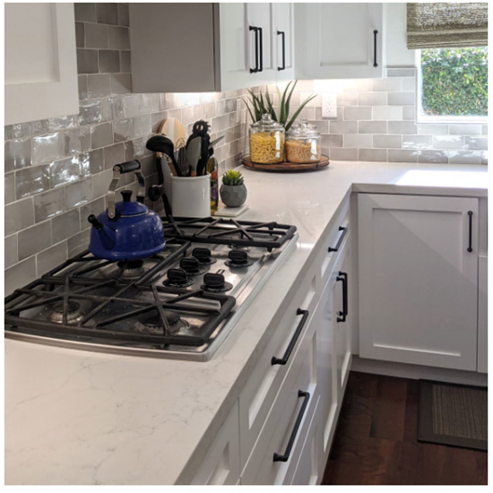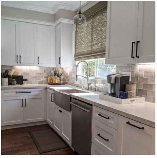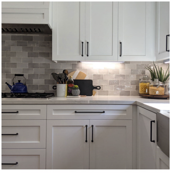 Our clients dreamed of a brighter and more timeless kitchen for a long time because their current kitchen was the exact opposite. It had dark cabinets with black granite countertops and backsplash and felt outdated. They wanted a space where their family would love to gather and that would feel welcoming, airy, and light. We knew that the base cabinet color would be white to give them that fresh, crisp, new start they were looking for. When it came to choosing finishes, Vadara countertops with its soft grey veining and white base were an easy choice since they brought in depth and perfectly complimented the multi-grey tone backsplash.