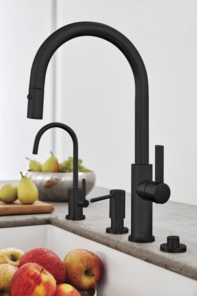 According to California Faucets, Matte Black is the new black. Offering a dramatic departure from stainless steel and chrome, black has broken through the barrier of traditional finish colors in a big way. Black brings warmth and elegance to a room, offering a refreshing change from the norm. California Faucets offers a variety of premium black hues for its recently-launched Kitchen Collection including Matte Black, Carbon Black, and Black Nickel.